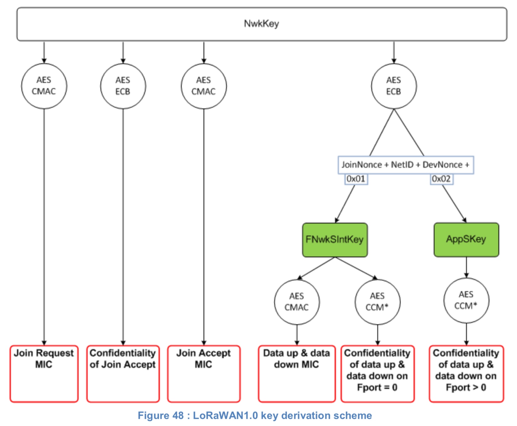 • 使用 NwkKey 派生 AppSKey 和 FNwkSIntKey 会话密钥,与在 LoRaWAN1.0 规范中一样。