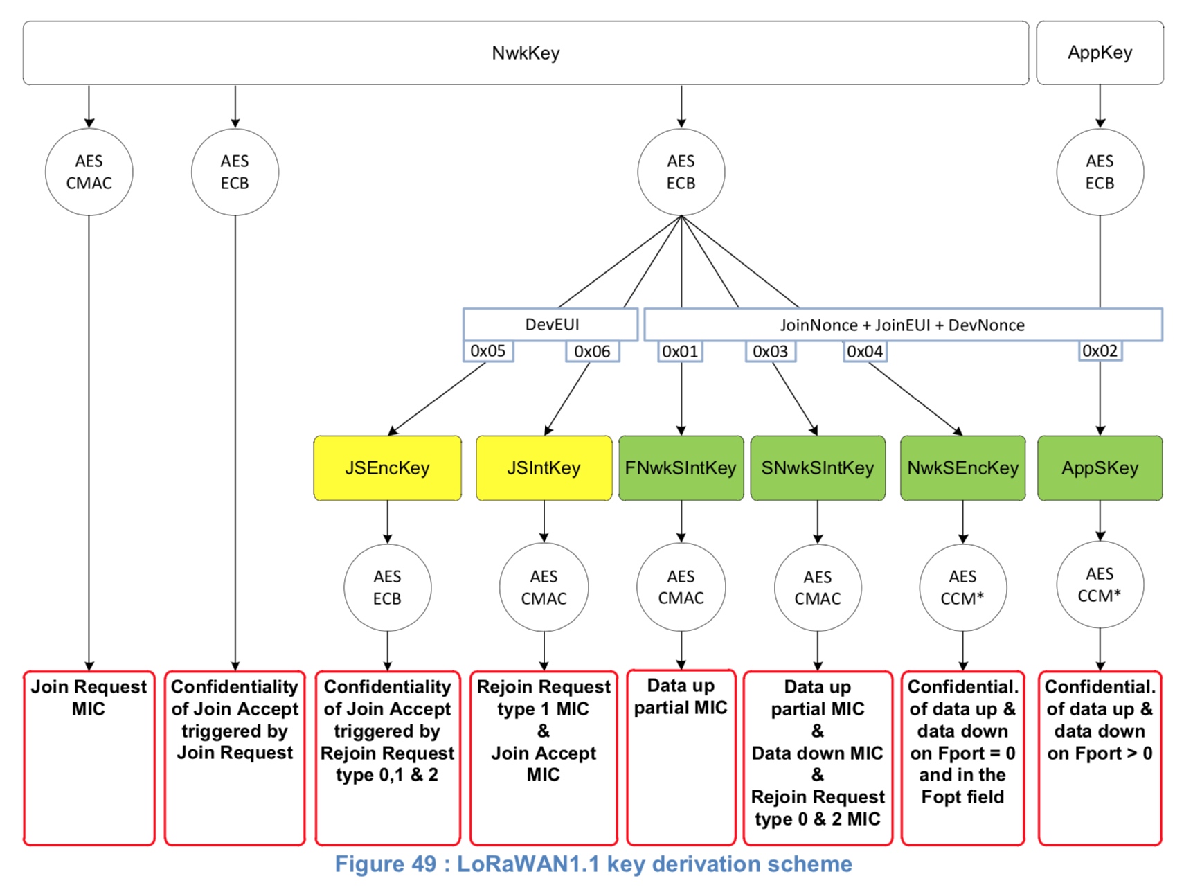 注意: 当使用 v1.1 网络服务器时,应用程序会话密钥只从 AppKey 派生,因此 NwkKey 可以交给网络操作员来管理连接过程,而不会因此让操作员能够窃听应用程序负载数据。