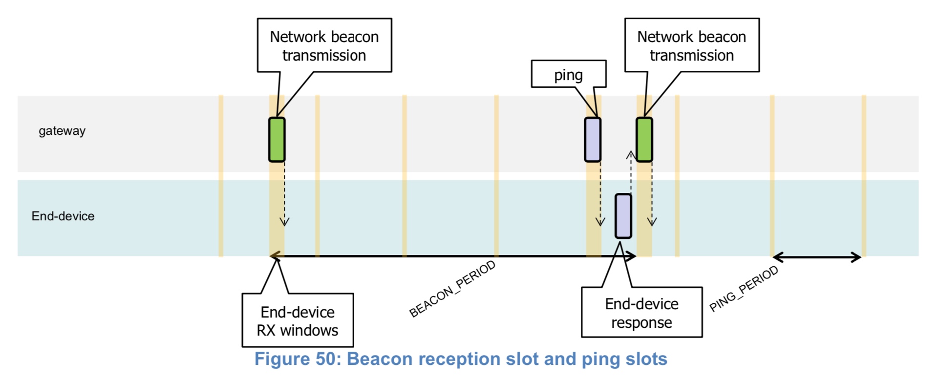 对于一个支持 Class B 的网络,所有网关必须同步广播一个信标,给所有终端提供一个参考时间。基于这个时间参考,终端可以周期性地打开接收窗口(下文称之为“ping slots”)可被网络设施用于发起下行通信。
